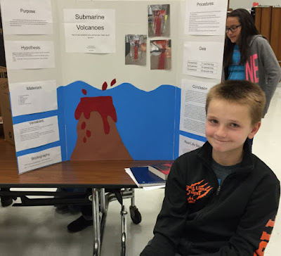 Ah, the science far. It is NOT my favorite assignment! It is a project that often involves the parent as much as the child. I was really quite impressed this year, as Cooper did most of his work at school (deciding the topic, the research, typing up and printing all the paperwork). We did do the actual experiment at home (I helped the first time, and then he did it on his own and took pictures). I helped with the paper-piecing of the volcano, but the assembly, positioning and adhering was all Cooper. His was just a simple water volcano (no baking soda or mentos and diet coke) ... showing that hot/colored water would rise to the top. The results were so-so.